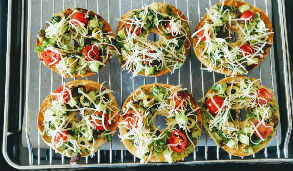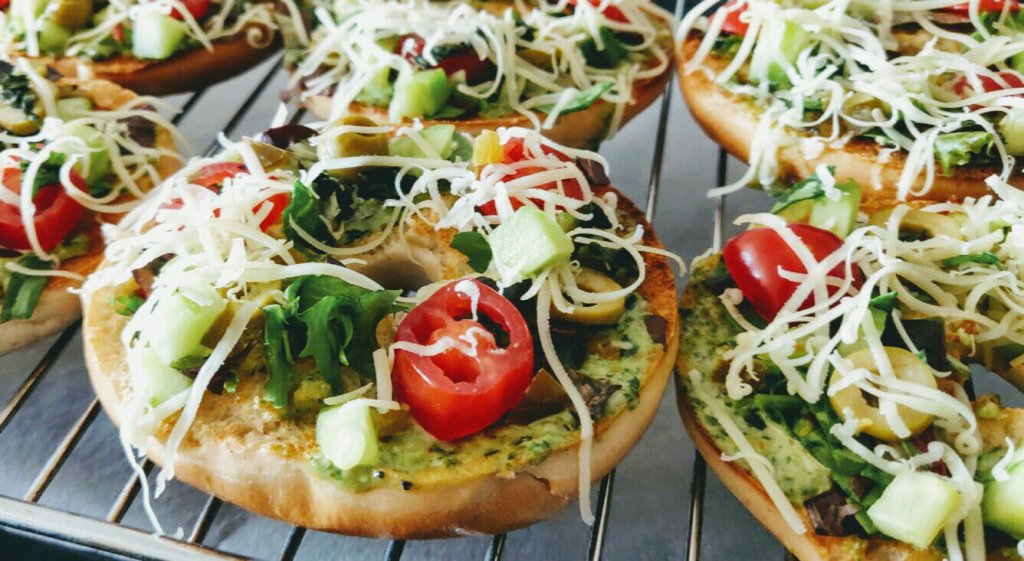 Simply toasted bagel, and brushed good pesto, sprinkled chopped cucumbers and cherry tomatoes, olives, salad leaves, cheese and seasoned with salt and pepper. I baked for 10 minutes to get that super crunchy yet chewy texture.
