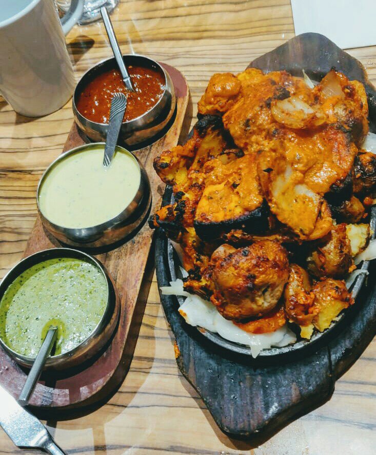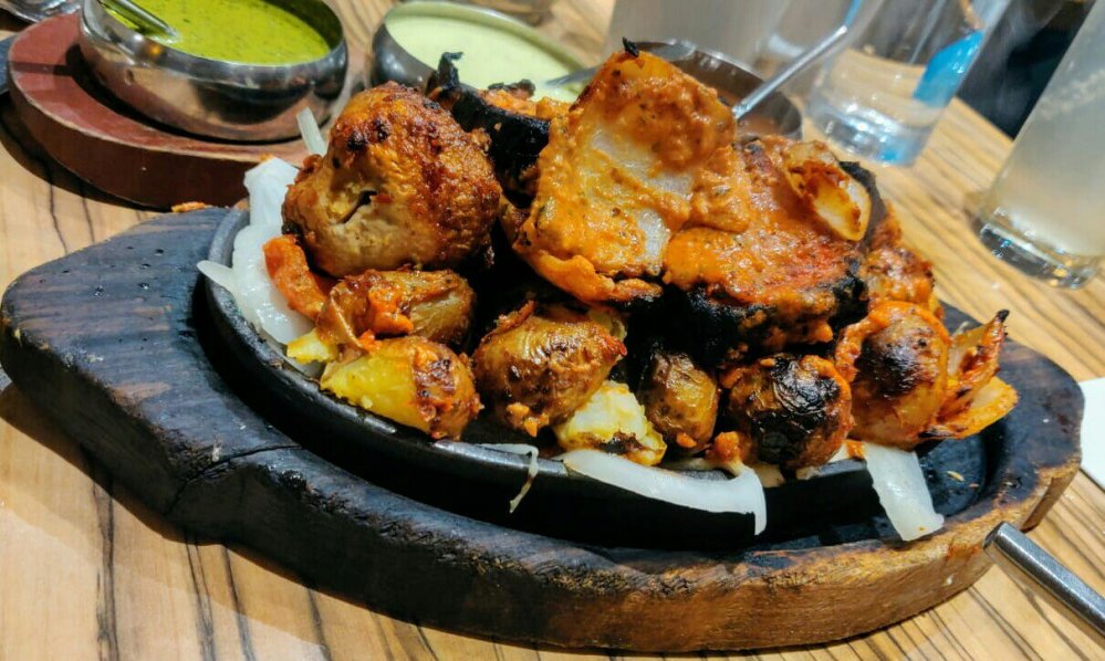 When we visited MJ in March, we ordered Vegetarian Tandoori Mixed Grill – smoky, charred and fresh baby potatoes, mushrooms and paneer coated in zesty yogurt sauce smothered in herbs and spices, It is cooked in tandoor, served in hot sizzler plate and accompanied with seasoned yogurt, tangy mango and coriander-mint chutneys. Such a delicious, sizzling and appetizing delicacy!