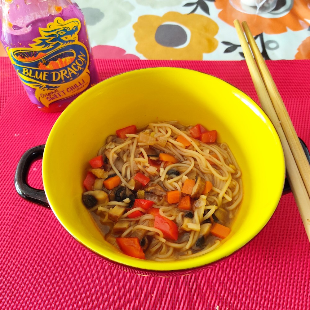 However, as London had no mood to bring sunshine (in summer) today, I cooked up this easy, quick and succulent recipe ready in 10 minutes! This one-pot recipe has the goodness of aromatic broth and goodness of noodles which is packed with Asian flavors, spicy aroma and a good hint of sweet chili.