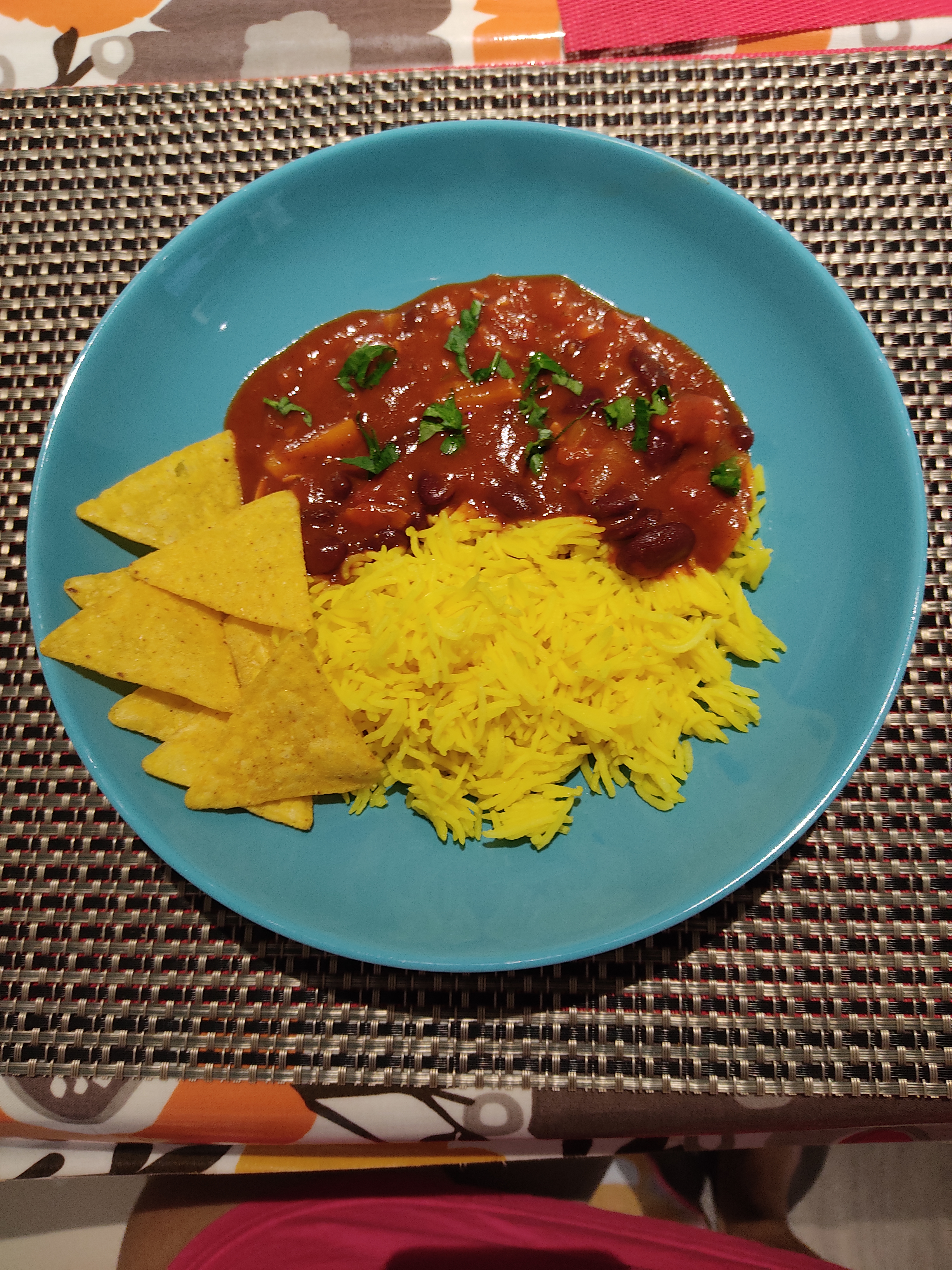 I made this quick meal with kidney beans, peppers and tomatoes served with Turmeric Rice and Tortilla Chips. Fresh sliced avocado as a side blends well too.